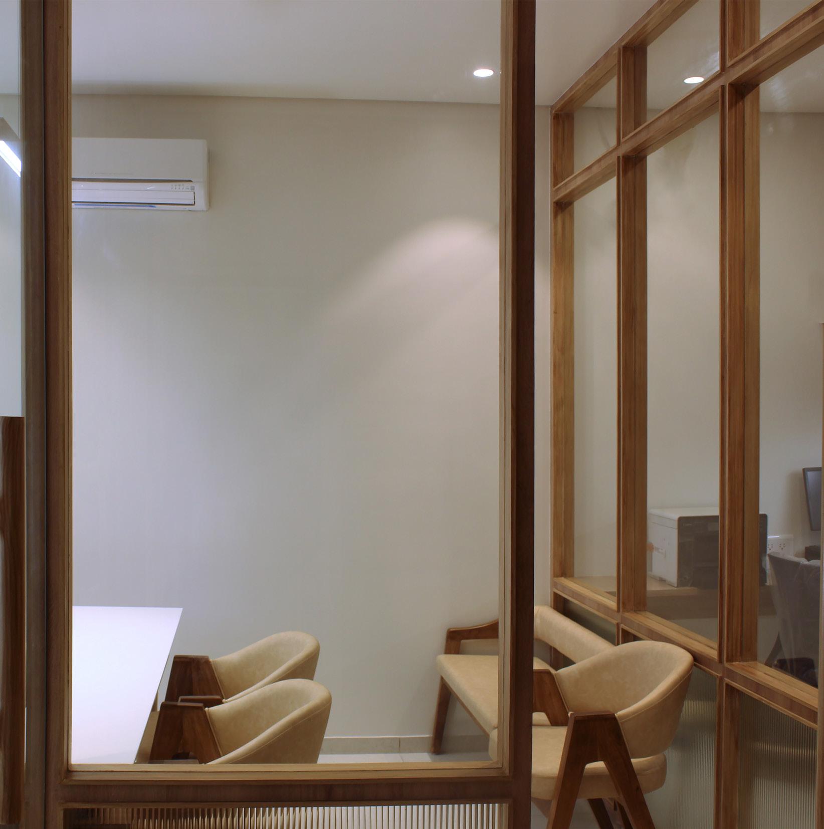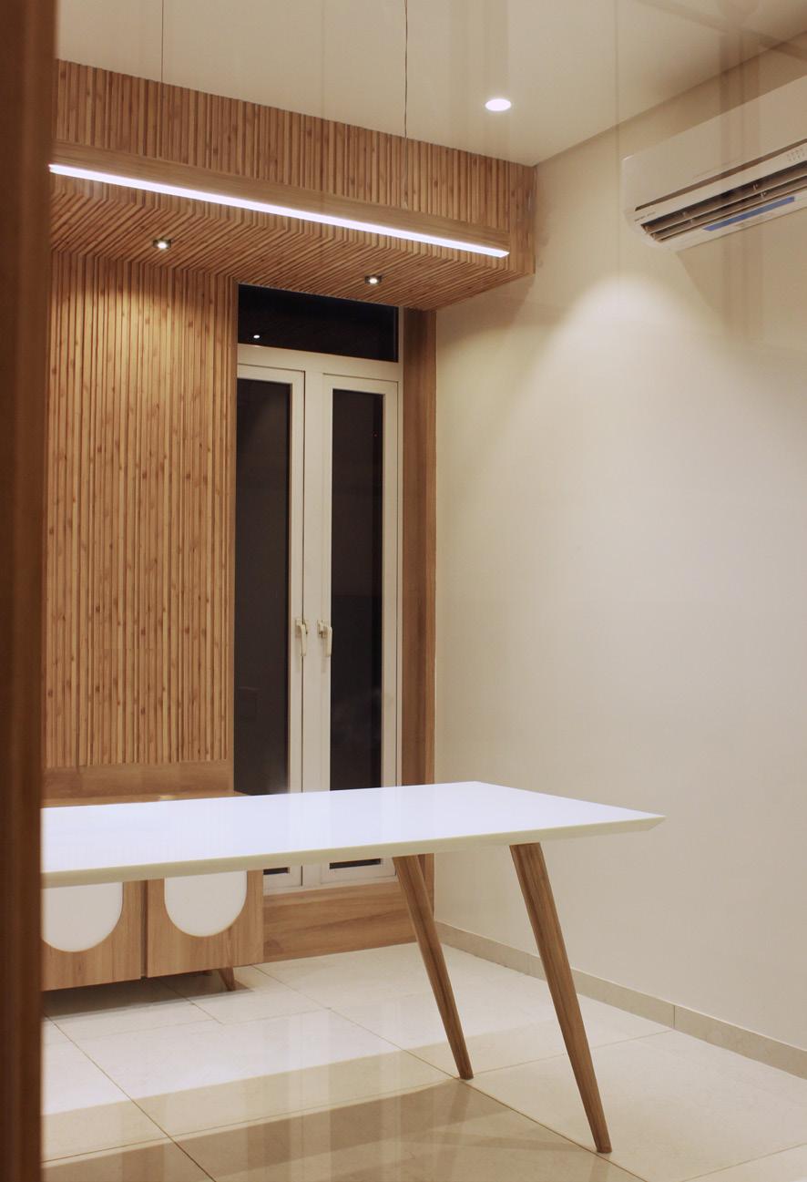 The office is to be planned for a CA. The client’s request was to design a very minimalist office with a pleasant working environment. The furniture, upholstery, and partitions have all been chosen to follow the monochromatic wooden concept. Furthermore, tables fea ture wooden handles and legs.
