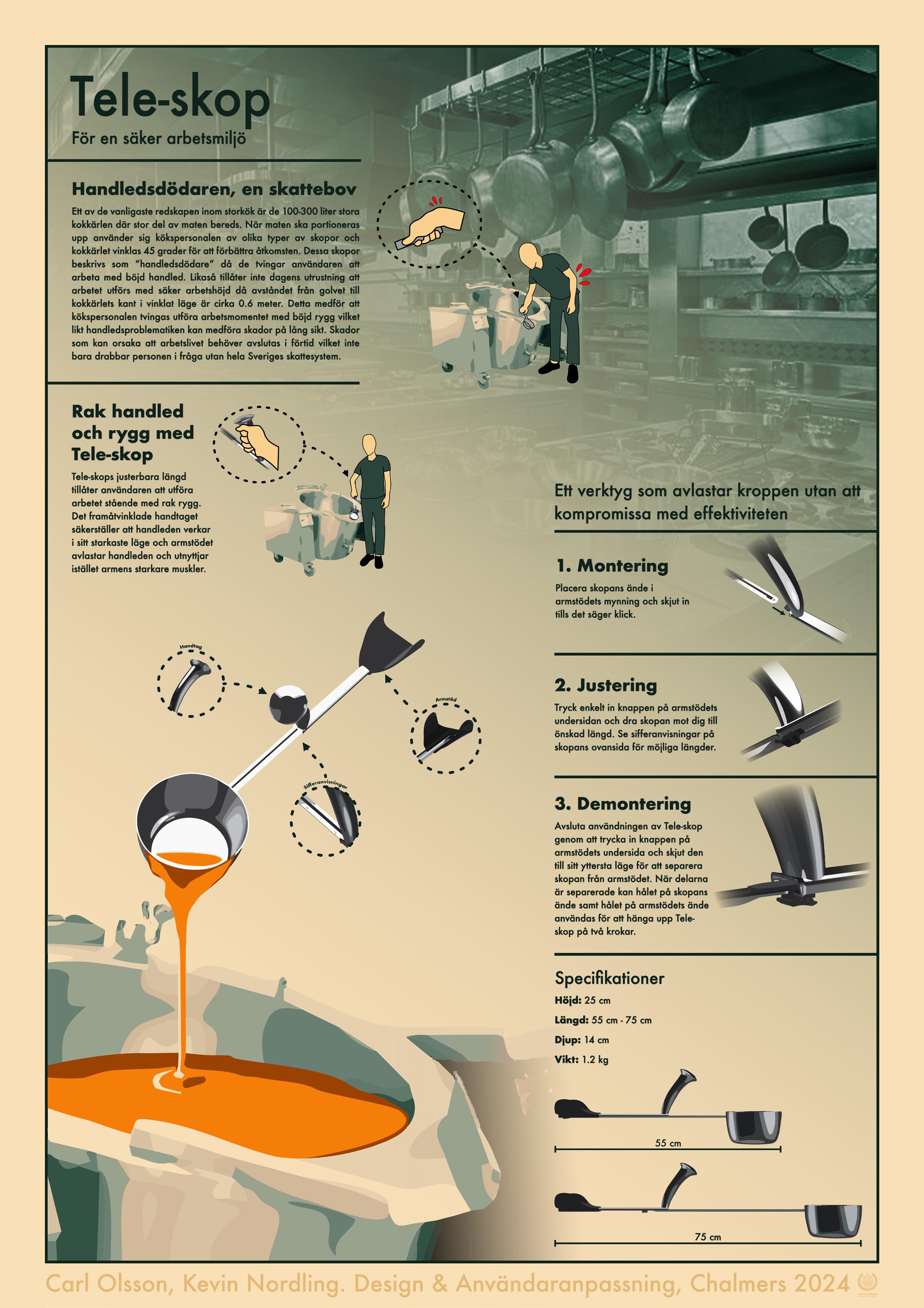 The “Tele-Skop” food scoop was developed as part of a UX Design course focused on identifying unmet user needs through field research. Our team conducted a comprehensive field study in industrial and high school kitchens, observing the workflows of chefs and kitchen staff to discover gaps in their existing tools. Through this study, we identified the need for a more ergonomic, adjustable tool to reduce strain on users’ wrists and backs while maintaining efficiency in their work. The final product is a food scoop designed to alleviate these issues.