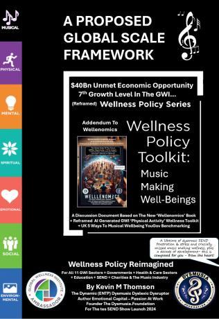 In contrast, wellbeing pertains to the perception of a state of being, with a prominent mental and emotional dimension. It involves the tactical execution of wellness strategies, focusing on individual and collective health outcomes. "Wellenomics Of Music Making Well-Beings" as a blueprint outlines a comprehensive Wellness Policy Music Making Toolkit, designed to implement these strategies across all wellness sectors, as well as in government, education, health, care, and charitable organizations. This approach aims to leverage the latest advancements in neuroscience and social neuroscience to achieve a £1Tn impact on global health and wellbeing measures.
