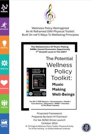 - The Global Wellness Institute (GWI) differentiates between wellness as strategic implications and wellbeing as tactical executions. The Wellness Policy Toolkit of Music Making Well-Beings and the Dysmusia Foundation's YouGov-based Benchmarking of The 5 Ways to Wellbeing framework aim to integrate music making into the broader wellness sector, creating a $4Bn economic opportunity and a $1Tn impact on global health.