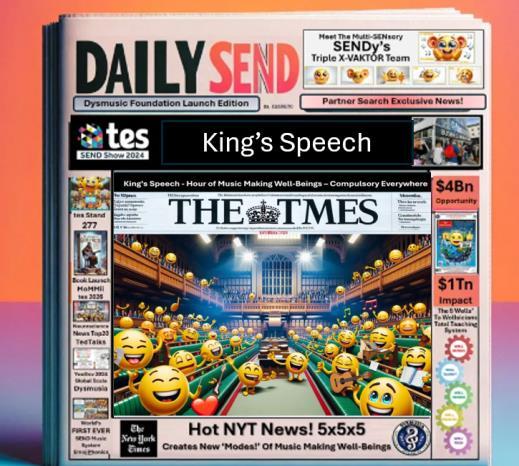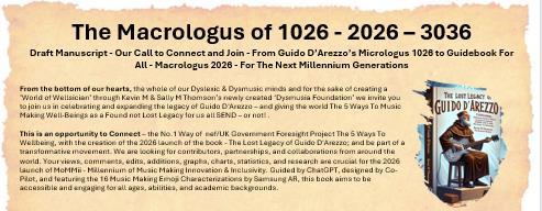 Kevin’s Dysmusic, Dyslexic, Dysruptor! passion for a new SEND Music Making Well-Beings Pedagogy aims to bridge the Creative Chasm between science, teaching, music-making technology, and both SEND and Wellbeing. The goal is to create 'The Lost - Now Found- Legacy of Guido D'Arezzo - A New Millennium of Music Making Innovation, Inclusivity - and Wellbeing and the $4Bn Opportunity for The GWI and $1Tn Impact for us all.'