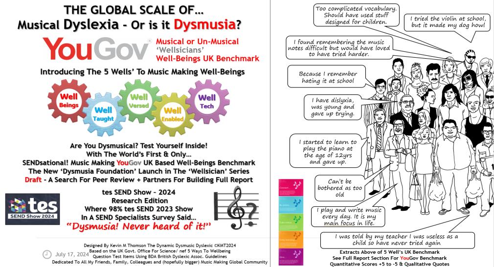 "The YouGov 5 Ways Research" delves into the revolutionary concept of Wellsicians and the groundbreaking analysis of the Circle of Dys'. This study, supported by the Dysmusia Foundation, explores the dual layers of SEN20% (Special Educational Needs) and SEND100% (Sensory Experience Natures & Diversities). By employing a unique +5 to -5 Connect Score, this report offers both qualitative and quantitative insights into musical dyslexia, or Dysmusia, on a global scale. This research underscores the profound impact of music making on well-being, paving the way for innovative strategies to foster inclusivity and cognitive development through the universal language of music.