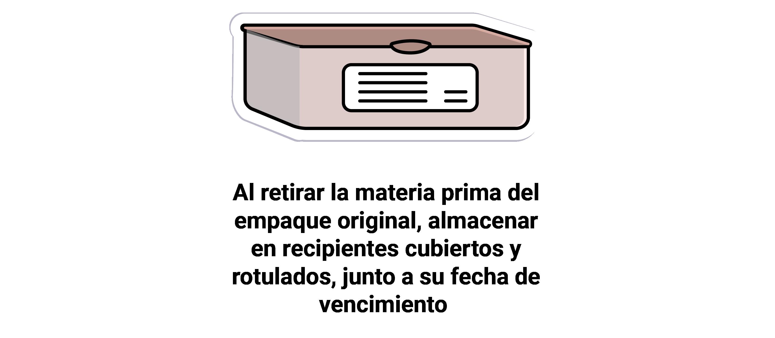 Toda materia prima que viene del lugar de producción, empacada en materiales como cartón, madera, mimbre o tela, debe trasladarse a recipientes propios del establecimiento, como cajones plásticos o de otro material de fácil limpieza, para evitar ingresar contaminación externa al lugar. Debe estar rotulado con fecha de recibo, fecha de vencimiento y lote.
