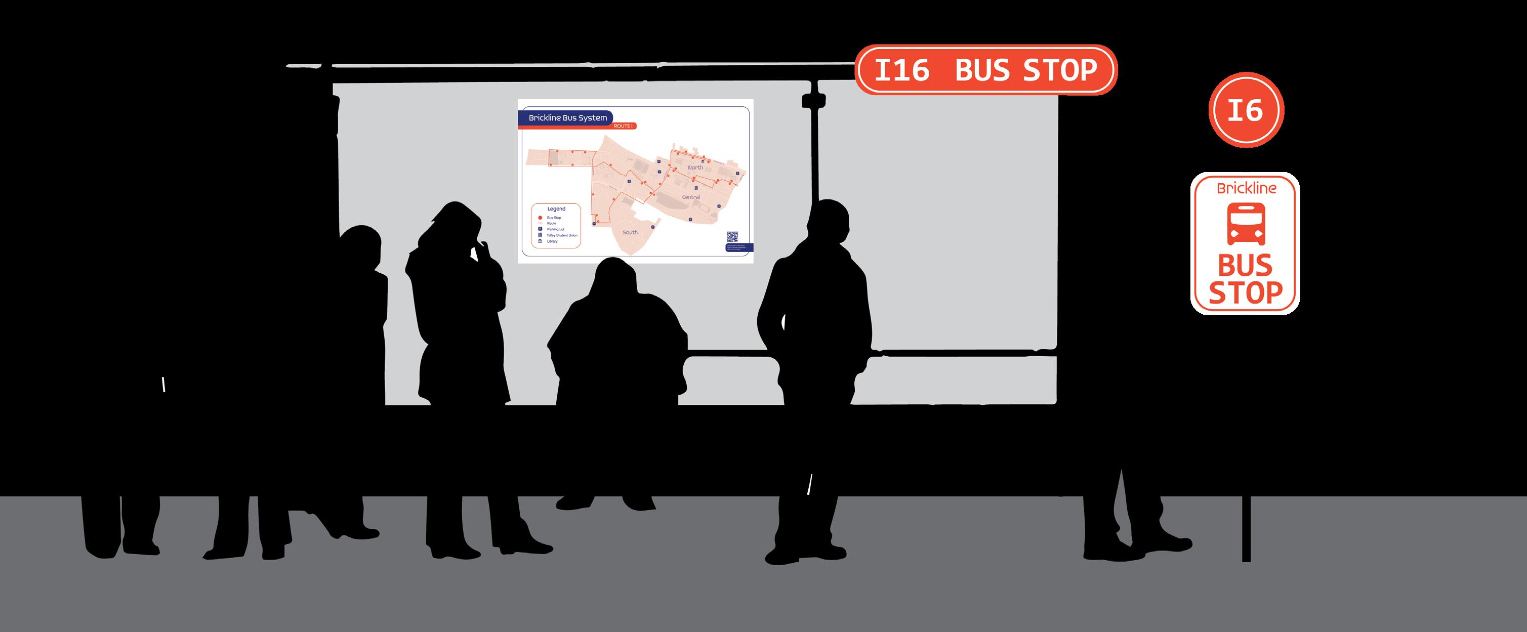 Brickline presents new and improved bus stop signage. The update bus stop signage includes the name of the route and the color of the route. This will help users identify the bus stop and know which route passes through it immediately. We also designed a new bus route map. Instead of including all routes at once and overwhelming the user, every bus stop has a bus map that includes the route that passes through that bus stop. The map has icons for popular buildings and parking as well. The map also includes a QR code that leads the user to download the Brickline app for further assitance on getting to their specific destination.