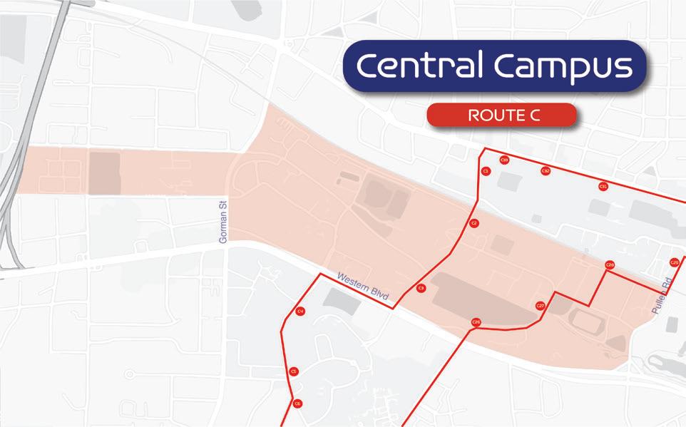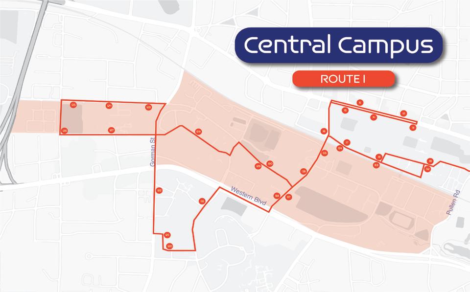 For example, in route I (displayed on the left) passing through central campus, its bus stop letter and number are signified in the orange circles along with the side of the street they are oriented on. The street names provide a reference to where the route might be passing through the central part of campus.