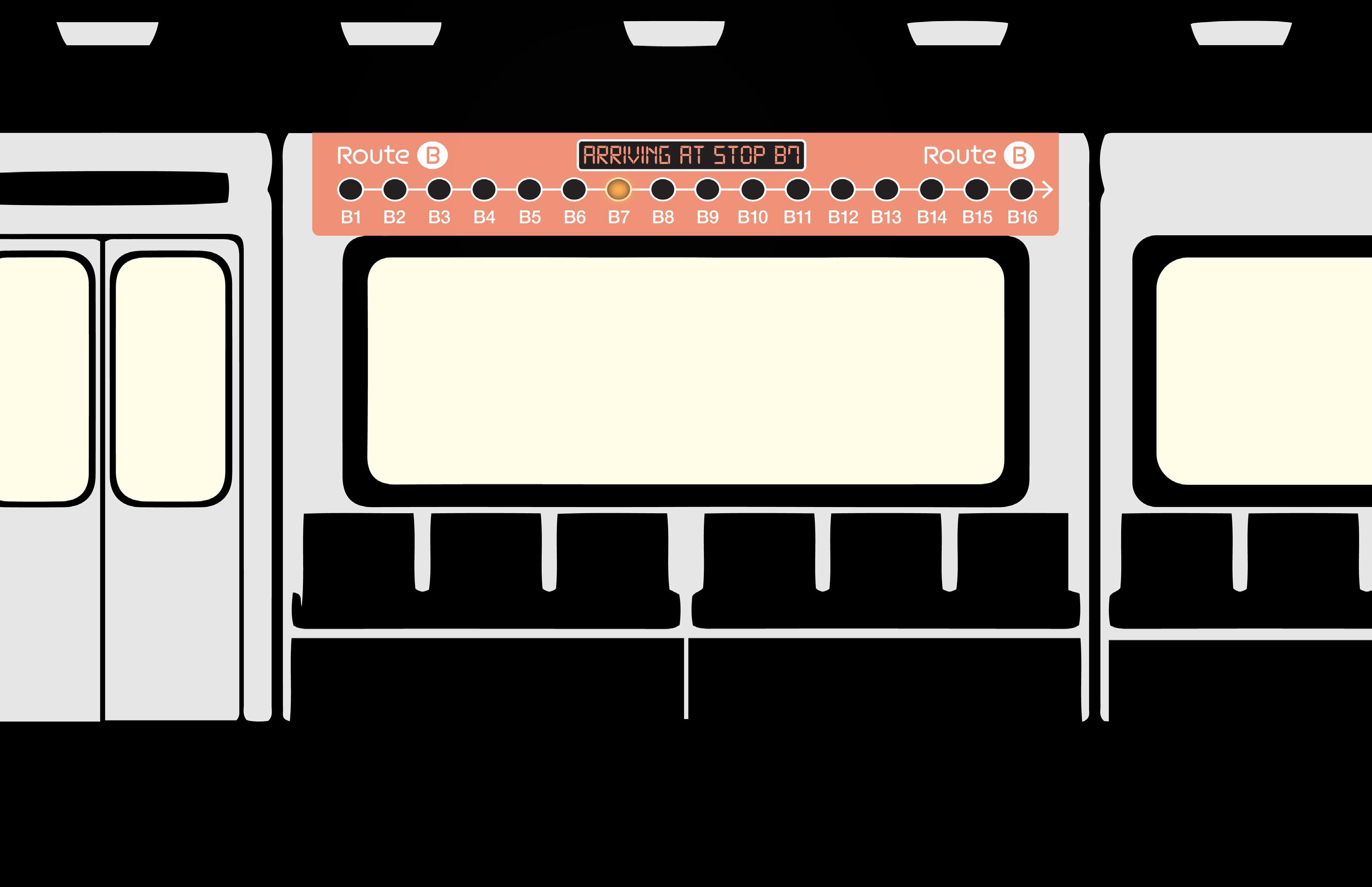 The live route map, located on the interior of the bus on the overhead panel, provides Brickline users with updates to the arrival of the following bus stop in order for them to follow along in real-time versus only on the app. The map also signals the arrival through sound with a pinging noise as well as an automated voice announcing the arrival in English and Spanish (nonEnglish speaking users).