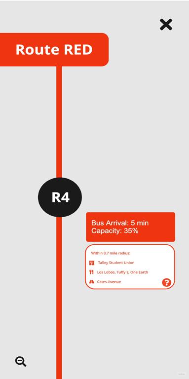 Users can toggle through different route options depending on the particular ones that pass through their chosen campus zone. When they tap on a route circle, the interactive map will dissolve into showing the individual route and its respective bus stops. The selected route will enlarge to differenciate from the other routes that were not selected. The home button can be clicked to select a new campus zone.
