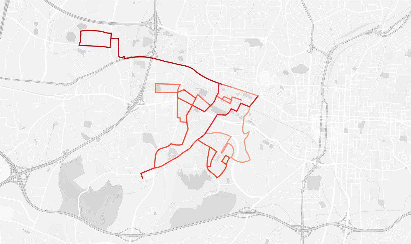 Using a simple design structures for NC State campus and its surrounding areas, the map for which the Brickline routes guide through are spilt up into 5 zones highlighting West, North, Central, South and Centennial Campus. These zones help users identify which part of campus they would like find a Brickline route in and reduce the overwhelming, expansive surface area of NC State campus as well as the complexities of a traditional map.