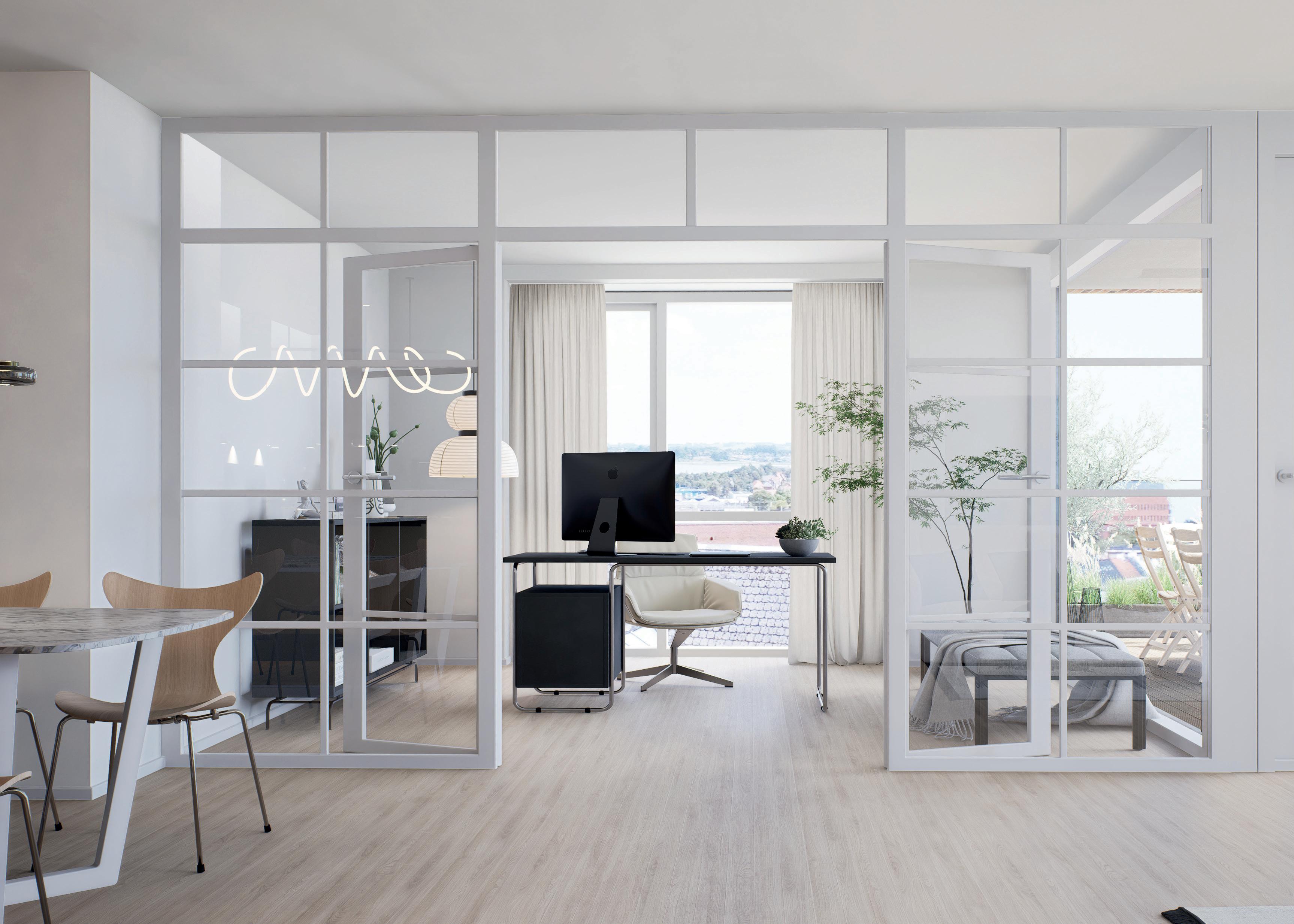 Et stort kontor med en glasvæg tilføjer ekstra lys og en åben atmosfære til lejligheden, samtidig med at du kan følge med i, hvad der sker i hjemmet.