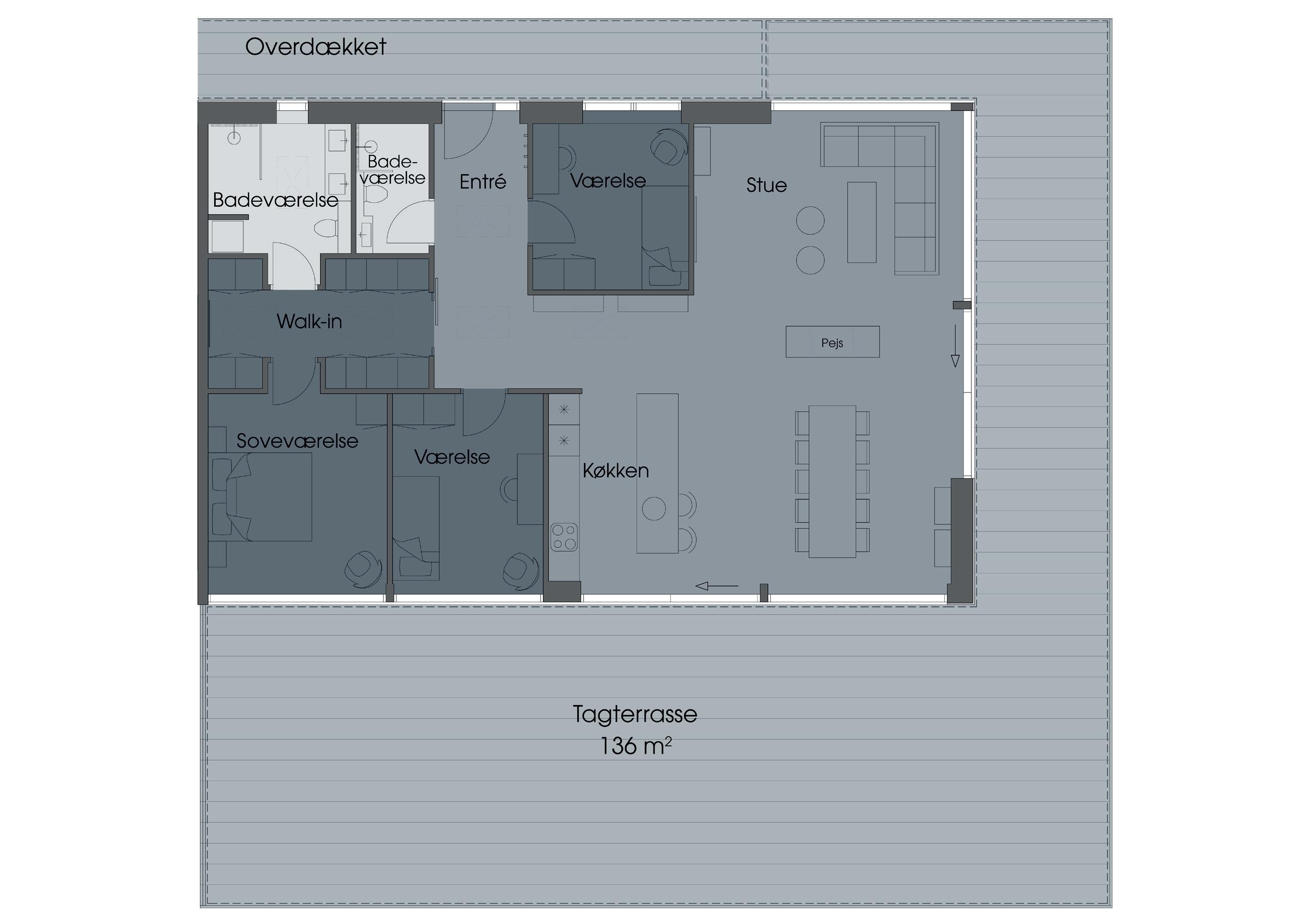 lys. Skydedøre åbner op til den store og rummelige tagterrasse. Denne udendørs oase giver dig mulighed for at skabe et komfortabelt loungeområde, en lille urtehave eller et andet udendørs rum, der passer til dine ønsker og behov.