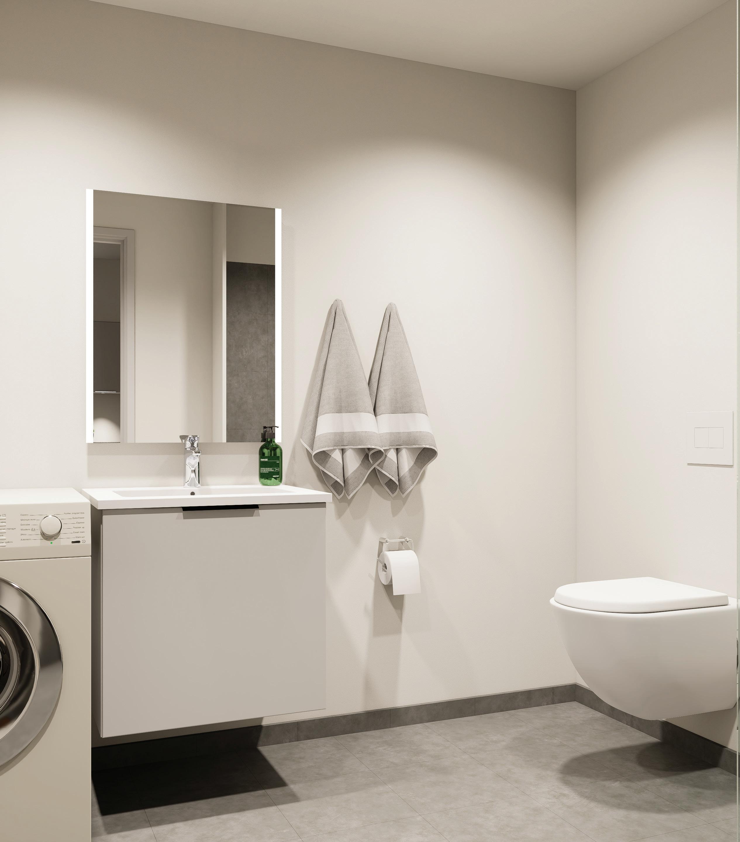 De to værelser kan tilpasses forskellige behov – det ene fungerer oplagt som soveværelse, mens det andet kan bruges som børneværelse, kontor eller gæsterum. Badeværelset er indrettet i et moderne design med bruseniche, toilet og vaskesøjle med både vaskemaskine og tørretumbler.