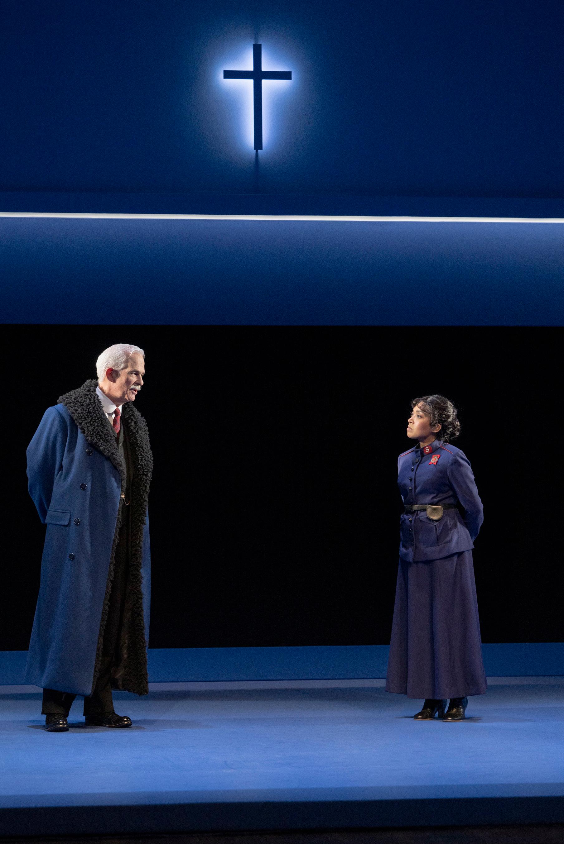 by Bernard Shaw, directed by Peter Hinton-Davis, set and costumes designed by Gillian Gallow, lighting designed by Bonnie Beecher, original music by Allen Cole. Patrick Galligan as Andrew Undershaft and Gabriella Sundar Singh as Barbara Undershaft.