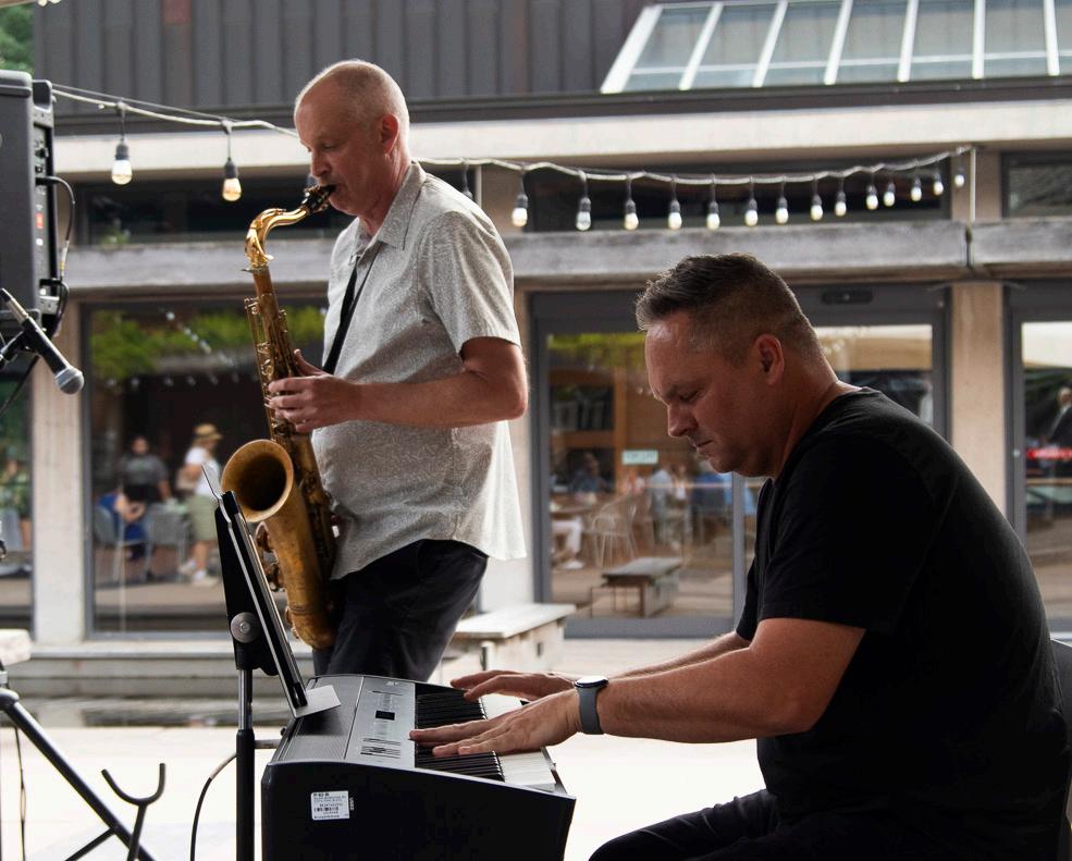 Clockwise from top: the Spiegeltent at dusk. Eponine Lee performs as The Troubadour. Audience at Pop-Up Patio, and Andy Ballantyne on saxophone with Ross MacIntyre on keyboard performing at Pop-Up Patio. Top photograph by Michael Cooper, other photographs by Katie Galvin.