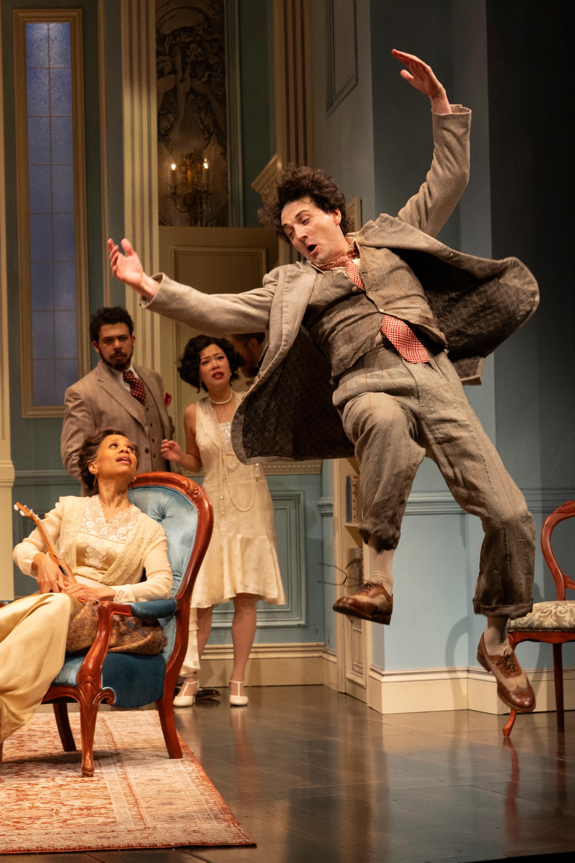 Left to right, seated: Nehassaiu deGannes as Miss Benita Mullet, Sepehr Reybod as George Maitland, Lindsay Wu as Jean Everard and Mike Nadajewski as Aubrey Henry Maitland Allington. Photography by David Cooper