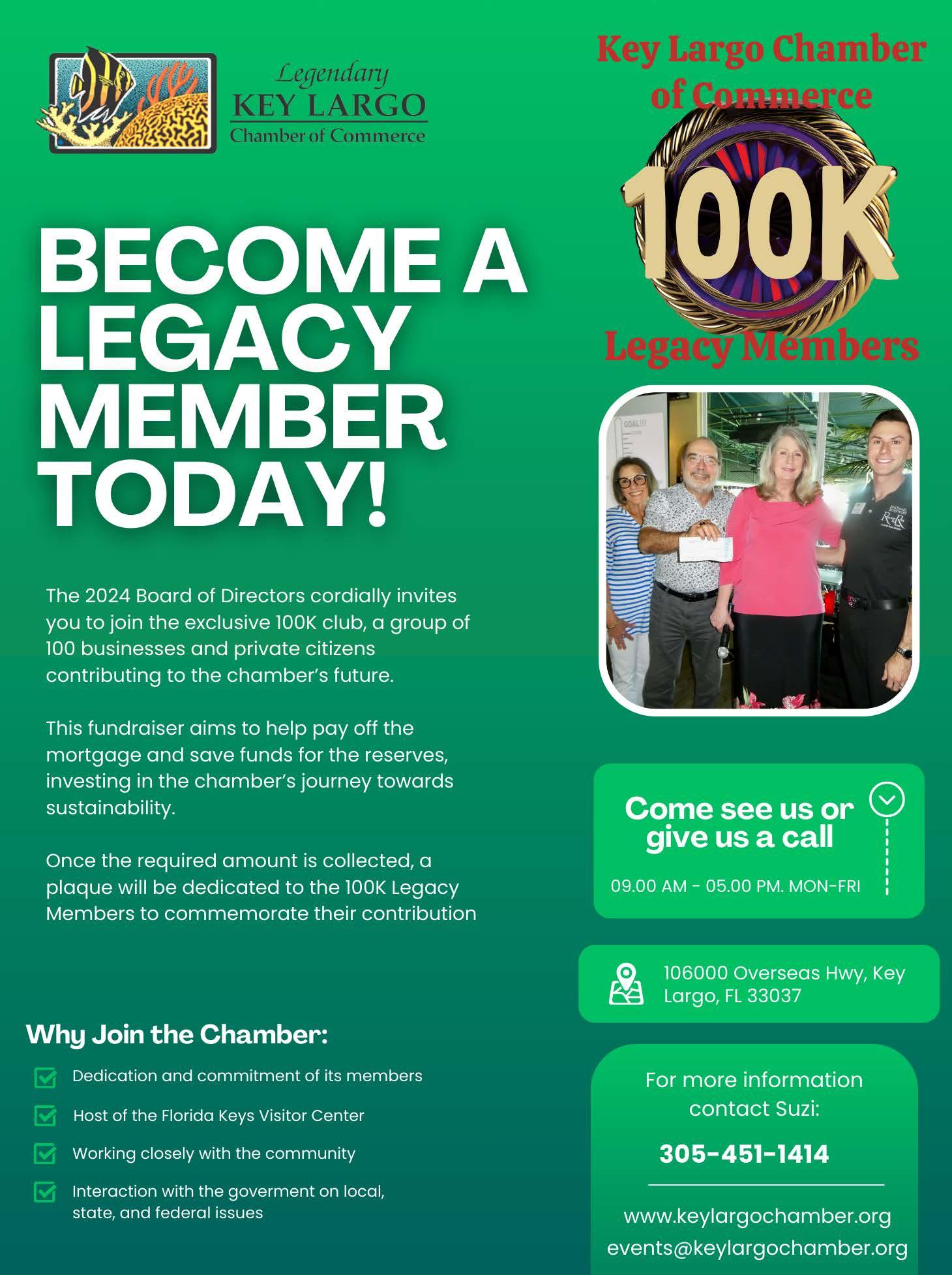 Join the Chamber's exclusive Legacy Member 100K Club to help raise $100,000 to pay off the chamber's mortgage and bolster reserves. The Key Largo Chamber is seeking 100 sponsorships of $1,000 per business or individual. Thank you to: