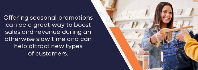 their city by offering promotional deals. This is a great way to make extra profit during the low season and tap into a new market. Reward repeat customers with loyalty promotions. Examples of promotions include: