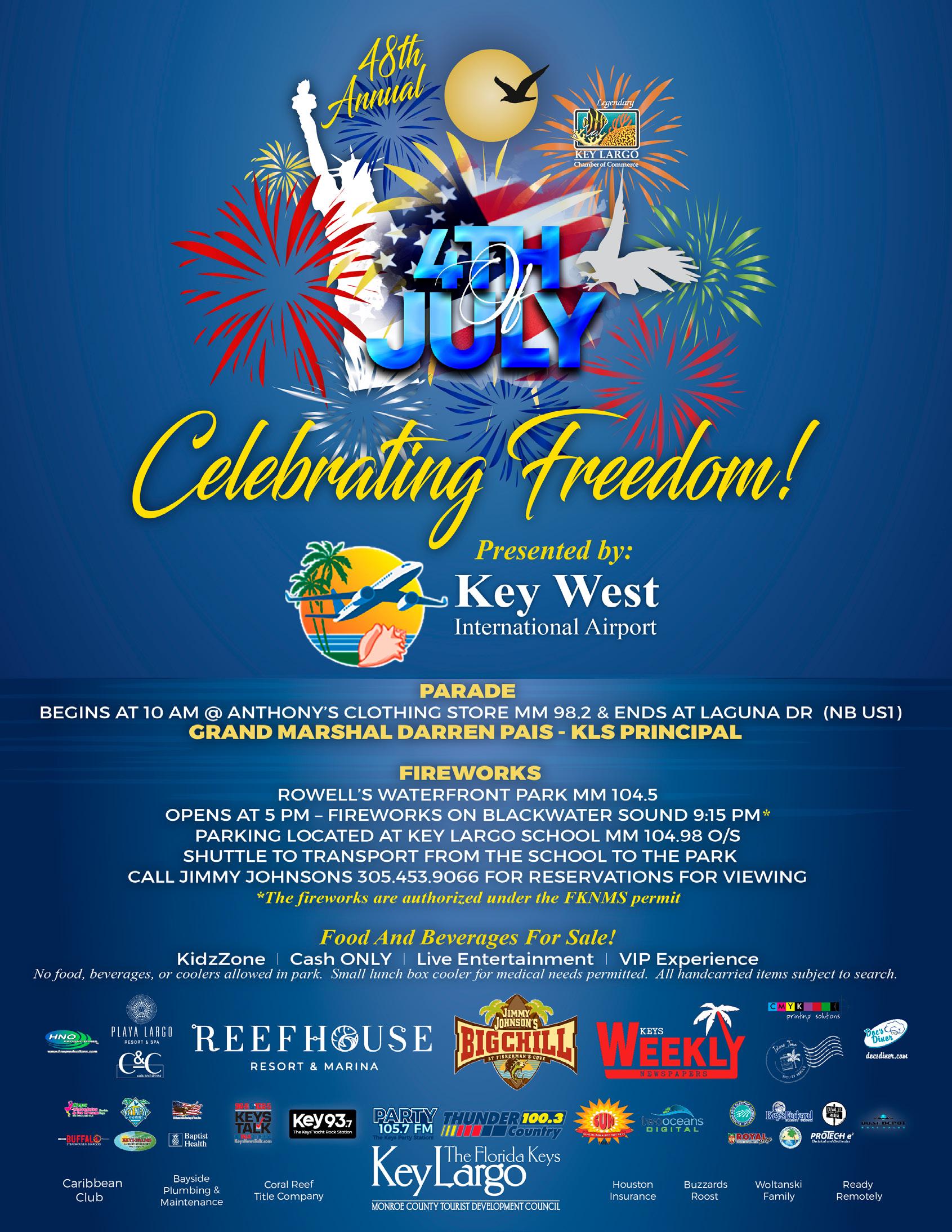 The Annual Bayfront Blackwater Sound Fireworks show, generously sponsored by Key West International Airport, will light up the sky at 9:15 p.m. For a prime view of the fireworks, consider our VIP Chalet Experience at Rowell's Waterfront Park or make a reservation at Jimmy
