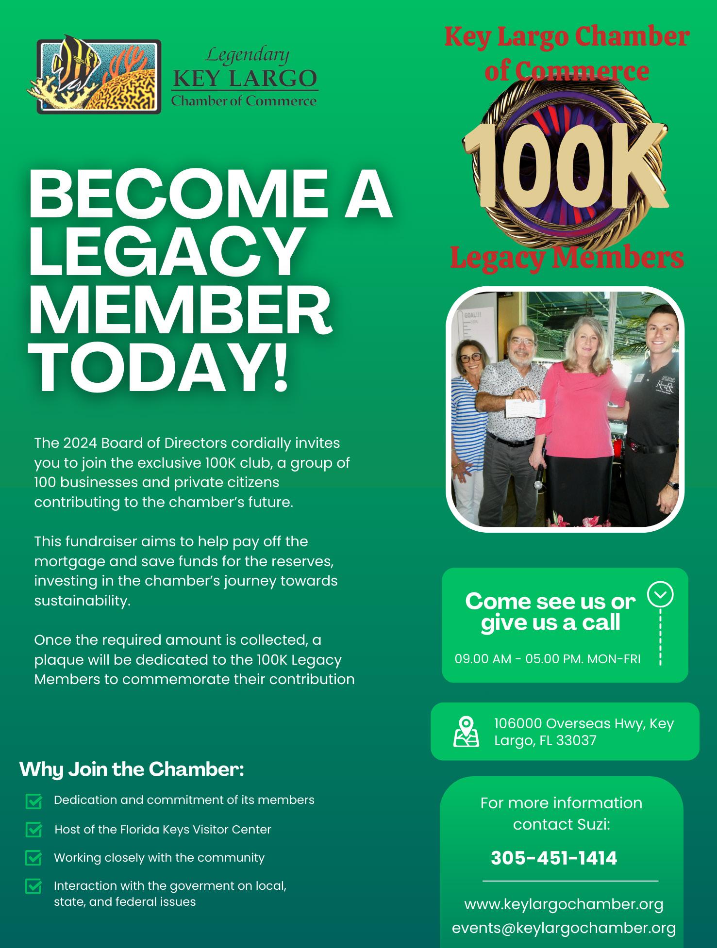 Join the Chamber's exclusive Legacy Member 100K Club to help raise $100,000 to pay off the chamber's mortgage and bolster reserves. The Key Largo Chamber is seeking 100 sponsorships of $1,000 per business or individual. Thank you to: