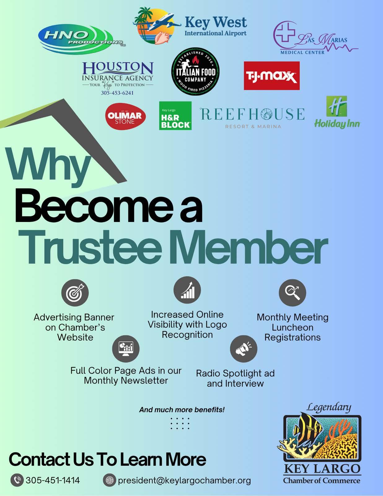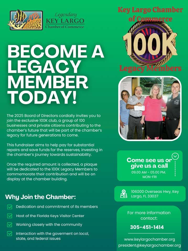 Join the Chamber's exclusive Legacy Member 100K Club to help raise $100,000 to pay off the chamber's mortgage and bolster reserves. The Key Largo Chamber is seeking 100 sponsorships of $1,000 per business or individual. Thank you to: