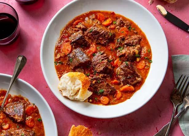 5. Bring stew to a simmer on stove, then transfer to a 300°F oven; stew should just barely bubble. Cook until beef is fork-tender (take an occasional small bite to be sure); about 2 1/2 hours. You can stop the cooking at any point and continue it later if needed. Let the stew cool, then cover and refrigerate overnight.