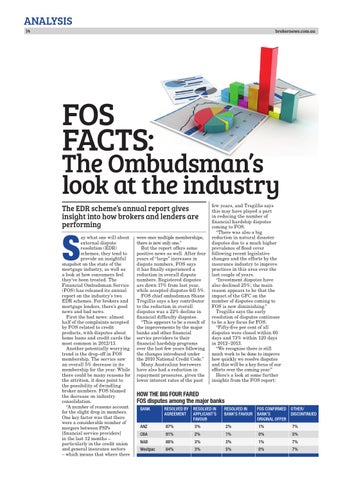 ay what one will about external dispute resolution (EDR) schemes, they tend to provide an insightful snapshot on the state of the mortgage industry, as well as a look at how consumers feel they’ve been treated. The Financial Ombudsman Service (FOS) has released its annual report on the industry’s two EDR schemes. For brokers and mortgage lenders, there’s good news and bad news. First the bad news: almost half of the complaints accepted by FOS related to credit products, with disputes about home loans and credit cards the most common in 2012/13. Another potentially worrying trend is the drop-off in FOS membership. The service saw an overall 5% decrease in its membership for the year. While there could be many reasons for the attrition, it does point to the possibility of dwindling broker numbers. FOS blamed the decrease on industry consolidation. “A number of reasons account for the slight drop in members. One key factor was that there were a considerable number of mergers between FSPs [financial service providers] in the last 12 months – particularly in the credit union and general insurance sectors – which means that where there