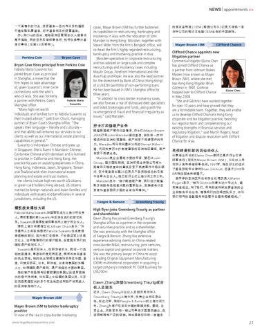 高伟绅委任新的诉讼合伙人 从事商业诉讼的Elaine Chen律师已离开孖士打律 师事务所(现名为Mayer Brown JSM),以合伙人身 份加入高伟绅律师事务所。1997年,她在孖士打结识 了香港顶级诉讼律师Brian Gilchrist,后者于2008年 5月转投到高伟绅麾下。 高伟绅的亚洲区诉讼和争议处理负责人Martin Rogers表示:“她与Gilchrist共事长达十年之久,堪 称黄金组合。有了他们,将有助高伟绅发展香港的企 业和税务诉讼业务,增强我们的区域团队实力,并与 我们现有的金融服务和监管诉讼服务相辅相成。”