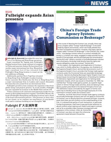 Fulbright 扩大亚洲阵营 ulbright & Jaworski 的北京和香港办事处近日新增五名律师。加盟 Fulbright北京代表处的法律顾问He Yuping来自一家中国大型国有石油 企业, Joanne Du 律师来自另一家著名的国际律师事务所,法律顾问Lori Ji 则从Fulbright的香港办公室调职至北京代表处开展工作。 此外,合伙人Steve Vogel从Fulbright伦敦办事处调职至香港。高级律师 Ben Smith从伦敦一家著名国际事务所转投Fulbright香港办事处,法律顾问 Alexandra Freeman也来自国际律所。 Fulbright在亚洲的发展提升了该所在全球运营项目的能力。近几个月 来,Fulbright还增加了在中东和英国的代表处。 Jeffrey Blount是Fulbright香港和北京办事处的负责人兼该所国际业务的 联席负责人,他表示“随着中国企业在全球的扩展,中国将继续是本所客户 的重要市场。我们在亚洲设立办事处对客户而言至关重要,我们将秉承提 供跨境服务的悠久传统,充分发挥本所优势。”