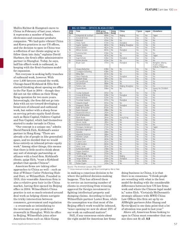 Mullin Richter & Hampton’s move to China in February of last year, where it represents a number of banks, electronics and consumer products companies. “We had quite vibrant China and Korea practices in our US offices, and the decision to open in China was a reflection of our clients urging us to follow them into Asia,” explains David Huebner, the firm’s office administrative partner in Shanghai. Today, he says, half his office’s work is outbound, in keeping with the firm’s business model for expansion. Not everyone is seeking hefty tranches of outbound work, however. With over 1,400 lawyers around the world, Chicago-based Kirkland & Ellis first started thinking about opening an office in the Far East in 2004 – though they did not cut the ribbon on their Hong Kong operation for two more years. Interestingly, the firm did not go into Asia with an eye toward developing a broad mix of inbound and outbound work, but rather with a sharp focus on serving private equity fund clients such as Bain Capital, Oaktree Capital and Sun Capital, which had themselves started to make inroads in China. “Our concept is a unique one,” admits David Patrick Eich, Kirkland’s senior partner in Hong Kong. “There are already a lot of people in [the generalist] space, and we decided that we would focus entirely on inbound private equity work.” Among other things, this means that there is little need to think about any sort of strategic partnership or alliance with a local firm. Kirkland’s clients, quips Eich, “want a Kirkland product that speaks Chinese”. American firms are taking other approaches to China as well – such as that of Wilmer Cutler Pickering Hale and Dorr, or WilmerHale. Founded in 1918, this venerable American firm is also a relative grey hair in the China market, having first opened its Beijing office in 2004. WilmerHale’s China practice is not so much oriented around deal work as helping clients navigate the tricky intersection between commerce, government and regulation – a crossroads as intimidating to the newcomer as any peak-hour crosswalk in Shanghai. With its office in Beijing, WilmerHale joins other American firms such as Akin Gump www.legalbusinessonline.com