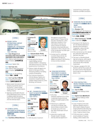 | CHINA | ► CHINA NEW ENTERPRISE INVESTMENT CO JIANGSU FEIDA GROUP INVESTMENT 新 企创投投资江苏飞达集团 Value: US$50m