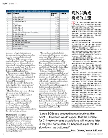 资源类企业的海外并购交易量,尤其是在澳大利 亚、非洲和拉美市场,增长最为强劲。中国铝业 与美国铝业联手以143亿美元联合收购力拓股权, 成为2008年亚洲规模最大的一笔交易。 中钢集团因以13亿美元收购澳洲中西部公司,成 为首个成功收购澳大利亚上市资源公司的国有企业。 中海油以25亿美元收购挪威离岸石油公司Awilco, 以及中石油以19亿美元收购加拿大上市石油公司 Tanganyika,均受到国际市场瞩目。 在资源丰富的地区,经验丰富且行业影响力较大 的跨国律师事务所颇受中国企业青睐。 的近的合伙人 Ian McCubbin 曾带领团队为中钢 集团收购 Midwest 提供法律顾问服务。 他透露,在过去12个月内,中国公司委托该所 进行的跨境并购工作量增长了近两倍。并购收入 的半数来自国有企业主导的跨境交易,其中多数 在资源领域。 而对于与大型国有企业、上市公司和私营企业保 持长期合作关系的国内律所来说,在过去几年内, 他们的服务范围亦在不断扩大,以便满足客户在国 际交易中产生的法律需求。 金杜律师事务所合伙人郭桂英是代理跨境并购方 面的资深律师。在2008年12月举办的北京国际并购 论坛上,她表示,金杜在近两年来看到中国客户赴 海外投资的项目数量和规模不断增加。其中约80% 的项目在资源和能源领域。 由于跨国交易多在外国司法管辖地进行,受当地 法律和法规的监管,因此国际律师事务所在此类交 易中具有得天独厚的优势,其作用至关重要。但国 内律所亦为交易中不可缺少的顾问角色,为中国收 购方提供相关中国法律服务。 凯文律师事务所合伙人张诗伟表示:“境外投资 通常涉及多个政府部门的复杂审批程序。协助客户 获得所有必要的审批许可是中国律师担当的重任之 一。”张诗伟近期曾为深圳中金岭南提供顾问服务, 协助该公司与印尼合作伙伴Antam合作,以4.7亿美 元共同收购澳大利亚Herald Resources。
