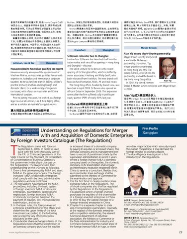 美亚博(Mayer Brown)近期宣布全球范围内提拔 14名律师为合伙人。在香港执业的Alan Yip成为了 美亚博的合伙人,他擅长处理香港和中国房地产事 务 他擅长处理香港和中国房地产事务。 他于2002 年加入孖士打律师事务所,而孖士打在2008年与美 亚博合并。