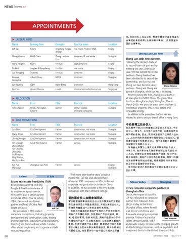 在近期举行的2009年度第二次合伙人会议上,中伦 合伙人一致认为,从今年下半年开始,法律服务市场 有回暖的迹象。因此,该所决定晋升三位律师为合伙 人。上海分所的张海晓律师被任命为二级合伙人,盛 军律师被晋升为授薪合伙人,位于总部的孙慧律师 也被晋升为授薪合伙人。 张海晓此前曾为上海元达律师事务所的合伙人。 今年三月,她从新加坡王律师事务所上海代表处加 入元达。张律师业务领域涵盖破产清算、知识产权、 兼并和收购、房地产以及可再生能源等,拥有13年国 内外律师事务所执业经验。她是美国纽约州律师协 会及中华全国律师协会会员。 该所同时宣布已原则通过于近期在香港设立办公 室的方案。