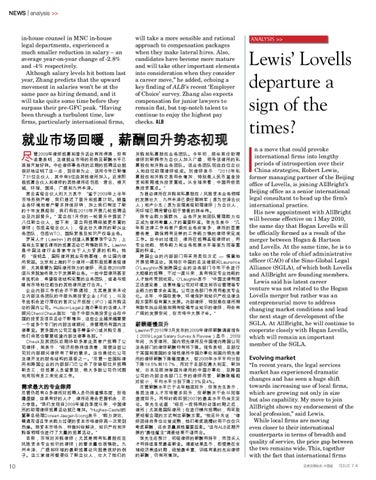 管2009年律师招募和晋升活动有所停滞,但有 迹象表明,法律就业市场的形势及薪酬水平已 逐渐开始好转。中伦律师事务所的近期的招聘活动就 很好地证明了这一点,到目前为止,该所今年已新增 了31位合伙人,其中有9位由其他律所加入。近来积 极招募合伙人和律师的其他律所还包括:君合、锦天 城、环球、国浩、广盛和九州丰泽。 君合高级合伙人刘大力表示:“鉴于2009年上半年 市场形势严峻,我们推迟了晋升和招募计划。随着 业务环境和客户需求持续好转,加上我们制定了新 的十年发展规划,我们将在2010年开展几轮招聘活 动及内部晋升。” 君合在1月份的一轮晋升中提拔了 八位新合伙人,接下来,君合将招聘经验更丰富的 律师(包括高级合伙人),借此壮大律所的新兴业 务团队,包括WTO、国际贸易及知识产权等业务。 罗英人才(LawInn)的创建人兼董事张宁认为,上 海和北京著名律所的招募活动已有强劲回升。LawInn 是中国法律行业首家专注于人力资源的机构。他 称:“很明显,国际律所就业形势萎缩,会让国内律 所受益。北京和上海的不少律所一直积极招募高级律 师,尤其是曾为国际律所效力的律师,而且自2009年 底以来就始终致力于发展新业务。一些中型律所甚至 寻找机会,希望吸收结构完整的业务团队,或者与规 模和市场地位相当的其他律所进行合并。” 企业内部工作机会亦不断涌现,尤其是原来未设 立内部法务团队的中型外商投资企业(FIE),以及 寻找机会进行潜在的首次公开招股(IPO)或并购活 动的国内公司。Hudson Legal上海办事处的法律人才 顾问Cherol Cheuk指出:“由于中型外商投资企业在中 国的投资及项目活动不断增加,这些企业越来越需要 一个或多个专门的内部法律顾问,来管理所有国内法 律事宜。更多国内公司正着手筹备IPO或并购交易, 他们自然也需要组建内部法律事务部。” Cheuk及其团队近期协助多家此类客户招聘了公 司律师,她表示:“经济形势持续改善,致使这些公 司对内部顾问律师有了新的需求。这也是优化公司 法律开支的财务结构的途径之一。”尽管一些国际律 所和跨国企业的内部部门已公布了空缺职位并招聘 新员工,但招募人员留意到,绝大多数公司仍试图 利用现有员工来完成工作。