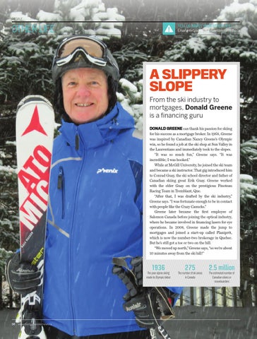A SLIPPERY SLOPE From the ski industry to mortgages, Donald Greene is a financing guru DONALD GREENE can thank his passion for skiing for his success as a mortgage broker. In 1968, Greene was inspired by Canadian Nancy Greene’s Olympic win, so he found a job at the ski shop at Sun Valley in the Laurentians and immediately took to the slopes. “It was so much fun,” Greene says. “It was incredible; I was hooked.” While at McGill University, he joined the ski team and became a ski instructor. That gig introduced him to Conrad Guay, the ski school director and father of Canadian skiing great Erik Guay. Greene worked with the elder Guay on the prestigious Pinoteau Racing Team in Tremblant, Que. “After that, I was drafted by the ski industry,” Greene says. “I was fortunate enough to be in contact with people like the Crazy Canucks.” Greene later became the first employee of Salomon Canada before joining the optical industry, where he became involved in financing lasers for eye operations. In 2008, Greene made the jump to mortgages and joined a start-up called Planiprêt, which is now the number-two brokerage in Quebec. But he’s still got a toe or two on the hill. “We moved up north,” Greene says, “so we’re about 10 minutes away from the ski hill!”