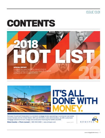IT’S ALL DONE WITH MONEY. Romspen Investment Corporation is a non-bank mortgage lender specializing in commercial real estate across Canada and the United States. With over $2 billion under administration, we offer customized mortgage solutions for term, bridge and construction financing from $4M to $100M. Blake Cassidy or Pierre Leonard | 800 494 0389 | www.romspen.com