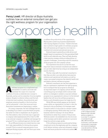 Penny Lovett is the director of HR for Bupa Australia. Bupa provides corporate wellness programs to more than 75 companies in Australia through HBA, MBF and Mutual Community. Lovett has been instrumental in developing and implementing Bupa’s corporate wellness offering. Visit www.bupa.com.au