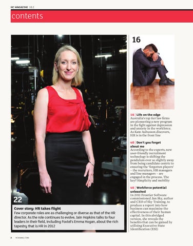 16 | Life on the edge Australia’s top tier law firms are pioneering a new program in the fight against depression and anxiety in the workforce. As Kate Aubusson discovers, HR is in the front line 40 | Don’t you forget about me According to the experts, new user-friendly recruitment technology is shifting the pendulum ever so slightly away from being candidate centric to ensuring the ‘forgotten players’ – the recruiters, HR managers and line managers – are engaged in the process. The key? Simplicity and mobility