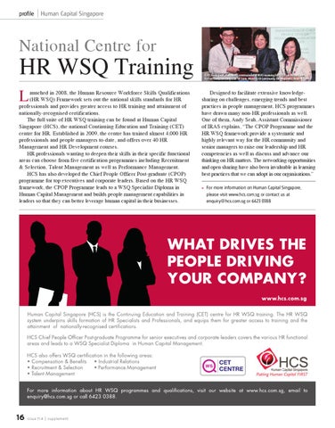 Designed to facilitate extensive knowledgesharing on challenges, emerging trends and best practices in people management, HCS programmes have drawn many non-HR professionals as well. One of them, Andy Seah, Assistant Commissioner of IRAS explains, “The CPOP Programme and the HR WSQ framework provide a systematic and highly relevant way for the HR community and senior managers to raise our leadership and HR competencies as well as discuss and advance our thinking on HR matters. The networking opportunities and open sharing have also been invaluable in learning best practices that we can adopt in our organisations.� + For more information on Human Capital Singapore, please visit www.hcs.com.sg or contact us at enquiry@hcs.com.sg or 6423 0388