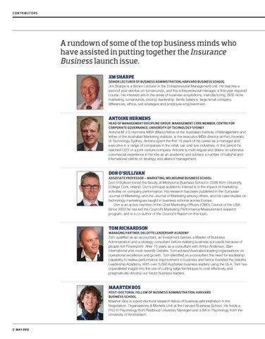 A rundown of some of the top business minds who have assisted in putting together the Insurance Business launch issue. JIM SHARPE