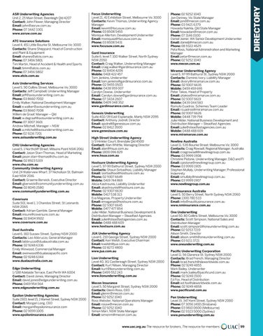 ATC Insurance Solutions Level 4, 451 Little Bourke St, Melbourne Vic 3000 Contacts: Shane Sheppard, Head of Construction and Plant & Equipment Email: shanes@atcis.com.au Phone: 07 3456 5801 Tim Martin, Head of Accident & Health and Sports Email: timm@atcis.com.au Phone: 07 3456 5802 www.atcis.com.au Axis Underwriting Services Level 5, 90 Collins Street, Melbourne Vic 3000 Contacts: Jeff Campbell, Underwriting Manager Email: jeff@axisunderwriting.com.au Phone: 03 8660 7002 Emily Walker, National Development Manager Email: e.walker@axisunderwriting.com.au Phone: 03 8660 7008 Willem de Graaf, Manager – Qld Email: w.degraaf@axisunderwriting.com.au Phone: 07 3007 3601 Andrew Mitchell, Manager – NSW Email: a.mitchell@axisunderwriting.com.au Phone: 02 9216 7201 www.axisunderwriting.com.au CHU Underwriting Agencies Level 5, 1 Northcliff Street, Milsons Point NSW 2061 Contact: Jason Starr-Thomas, Head of Marketing Email: jason.starr-thomas@chu.com.au Phone: 02 8923 5319 www.chu.com.au Community Underwriting Agency Unit 24 Waterview Wharf, 37 Nicholson St, Balmain East NSW 2041 Contact: Graeme Berwick, Executive Director Email: gberwick@communityunderwriting.com.au Phone: 02 8045 2580 www.communityunderwriting.com.au Coversure Suite 501, level 1, 1 Chandos Street, St Leonards NSW 2065 Contact: Adrian Gamble, General Manager Email: insure@coversure.com.au Phone: 02 8404 9502 www.coversure.com.au Dual Australia Level 6, 160 Sussex Street, Sydney NSW 2000 Contacts: Leo Abbruzzo, General Manager Email: labbruzzo@dualaustralia.com.au Phone: 02 9248 6336 Emily Winwood, Commercial Manager Email: ewinwood@dualasiapacific.com Phone: 02 9248 6344 www.dualaustralia.com.au Edge Underwriting 1/188 Adelaide Terrace, East Perth WA 6004 Contact: David Jones, Managing Director Email: david.jones@edgeunderwriting.com.au Phone: 0419 954 564 www.edgeunderwriting.com.au Epsilon Underwriting Agencies Suite 1503, level 15, 1 Market Street, Sydney NSW 2000 Contact: Morgan Long, CEO Email: morgan@epsiloninsurance.com Phone: 02 9099 1005 www.epsiloninsurance.com