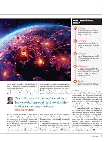 “Virtually every carrier we’ve spoken to has expectations of at least low doubledigit price increases next year” Kenneth Saldanha, Accenture for the insurance industry is what Wolfe describes as “the depressingly low yield environment we’re in, from an interest rate standpoint,” which has had a particularly strong impact on companies writing longtail insurance lines. “It’s a double whammy when you talk about improving rate, either in insurance