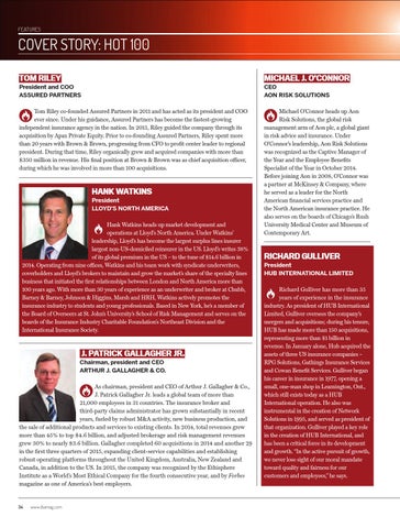 J. PATRICK GALLAGHER JR. Chairman, president and CEO ARTHUR J. GALLAGHER & CO. As chairman, president and CEO of Arthur J. Gallagher & Co., J. Patrick Gallagher Jr. leads a global team of more than 21,000 employees in 31 countries. The insurance broker and third-party claims administrator has grown substantially in recent years, fueled by robust M&A activity, new business production, and the sale of additional products and services to existing clients. In 2014, total revenues grew more than 45% to top $4.6 billion, and adjusted brokerage and risk management revenues grew 30% to nearly $3.6 billion. Gallagher completed 60 acquisitions in 2014 and another 29 in the first three quarters of 2015, expanding client-service capabilities and establishing robust operating platforms throughout the United Kingdom, Australia, New Zealand and Canada, in addition to the US. In 2015, the company was recognized by the Ethisphere Institute as a World’s Most Ethical Company for the fourth consecutive year, and by Forbes magazine as one of America’s best employers.