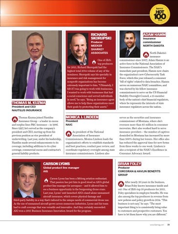 THOMAS M. KUZMA President and CEO NAUTILUS INSURANCE Thomas Kuzma joined Nautilus Insurance Group – a leader in excess and surplus lines P&C insurance – in 1986. Since 1997, he’s served as the company’s president and CEO, moving up from his previous position as vice president of underwriting. Last year, under his leadership, Nautilus made several enhancements to its coverage, including additions to its cyber coverage, commercial excess and contractor’s general liability products.
