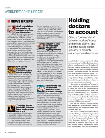 Holding doctors to account Citing a “defined delta” between workers’ comp and private claims, one expert is calling on the industry to promote evidence-based medicine A leader in the workers’ comp space is calling on insurers to start holding doctors accountable for what he describes as a “defined delta” between workers’ compensation claims and private health or non-occupational disability claims. Christopher Schaffer, the president and chief executive of Charles Taylor TPA, says this delta reflects the trend of workers’ comp claims costing more and taking longer to resolve than private healthcare claims in the non-occupational environment. “There’s just no reason for that,” he says. “If you’re injured at work, there’s no reason why it should cost more or take longer to recover than if you were injured outside of work – and yet that’s what’s happening. It’s a delta that’s easy to identify, and the workers’ compensation doctors are complicit in that delta. I think we as an industry have to try to close that delta and hold doctors to account.” One way the insurance industry can do this, Schaffer says, is by promoting evidencebased medicine and using claims data to challenge the status quo. “We can use scientific and evidence-based data to challenge workers’ compensation doctors if their treatment is not performing as well as their peers and colleagues in the wider healthcare industry,” he says. “It’s important to highlight that. If doctors are only treating workers’ compensation claimants, they might not see or feel the differences