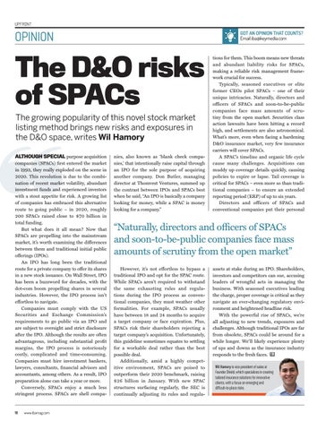 The D&O risks of SPACs The growing popularity of this novel stock market listing method brings new risks and exposures in the D&O space, writes Wil Hamory ALTHOUGH SPECIAL purpose acquisition companies (SPACs) first entered the market in 1993, they really exploded on the scene in 2020. This revolution is due to the combination of recent market volatility, abundant investment funds and experienced investors with a stout appetite for risk. A growing list of companies has embraced this alternative route to going public – in 2020, roughly 200 SPACs raised close to $70 billion in total funding. But what does it all mean? Now that SPACs are propelling into the mainstream market, it’s worth examining the differences between them and traditional initial public offerings (IPOs). An IPO has long been the traditional route for a private company to offer its shares in a new stock issuance. On Wall Street, IPO has been a buzzword for decades, with the dot-com boom propelling shares in several industries. However, the IPO process isn’t effortless to navigate. Companies must comply with the US Securities and Exchange Commission’s requirements to go public via an IPO and are subject to oversight and strict disclosure after the IPO. Although the results are often advantageous, including substantial profit margins, the IPO process is notoriously costly, complicated and time-consuming. Companies must hire investment bankers, lawyers, consultants, financial advisors and accountants, among others. As a result, IPO preparation alone can take a year or more. Conversely, SPACs enjoy a much less stringent process. SPACs are shell compa-