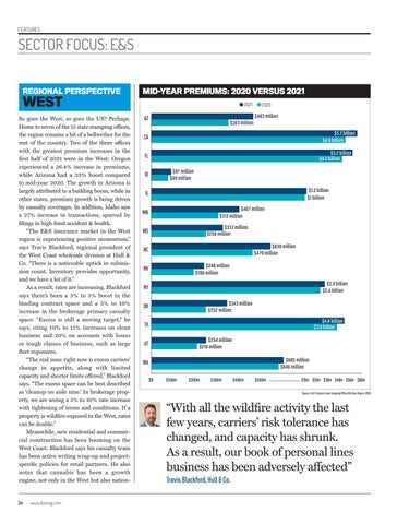 So goes the West, so goes the US? Perhaps. Home to seven of the 15 state stamping offices, the region remains a bit of a bellwether for the rest of the country. Two of the three offices with the greatest premium increases in the first half of 2021 were in the West: Oregon experienced a 36.4% increase in premiums, while Arizona had a 33% boost compared to mid-year 2020. The growth in Arizona is largely attributed to a building boom, while in other states, premium growth is being driven by casualty coverages. In addition, Idaho saw a 27% increase in transactions, spurred by filings in high-limit accident & health. “The E&S insurance market in the West region is experiencing positive momentum,” says Travis Blackford, regional president of the West Coast wholesale division at Hull & Co. “There is a noticeable uptick in submission count. Inventory provides opportunity, and we have a lot of it.” As a result, rates are increasing. Blackford says there’s been a 3% to 5% boost in the binding contract space and a 5% to 10% increase in the brokerage primary casualty space. “Excess is still a moving target,” he says, citing 10% to 15% increases on clean business and 20% on accounts with losses or tough classes of business, such as large fleet exposures. “The real issue right now is excess carriers’ change in appetite, along with limited capacity and shorter limits offered,” Blackford says. “The excess space can be best described as ‘cleanup on aisle nine.’ In brokerage property, we are seeing a 5% to 10% rate increase with tightening of terms and conditions. If a property is wildfire-exposed in the West, rates can be double.” Meanwhile, new residential and commercial construction has been booming on the West Coast. Blackford says his casualty team has been active writing wrap-up and projectspecific policies for retail partners. He also notes that cannabis has been a growth engine, not only in the West but also nation-