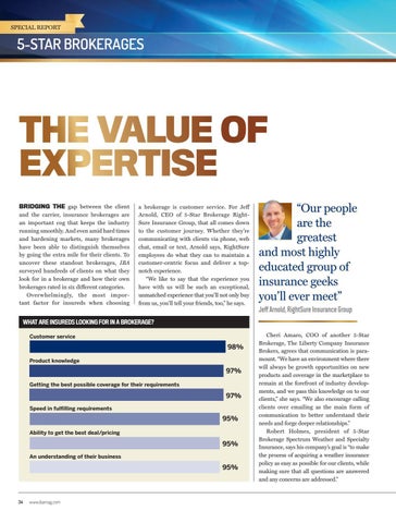 THE VALUE OF EXPERTISE BRIDGING THE gap between the client and the carrier, insurance brokerages are an important cog that keeps the industry running smoothly. And even amid hard times and hardening markets, many brokerages have been able to distinguish themselves by going the extra mile for their clients. To uncover these standout brokerages, IBA surveyed hundreds of clients on what they look for in a brokerage and how their own brokerages rated in six different categories. Overwhelmingly, the most important factor for insureds when choosing