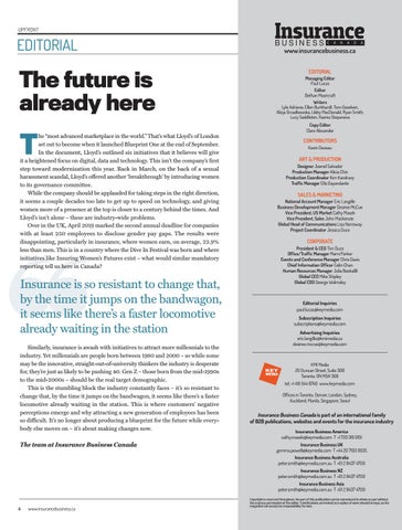 www.insurancebusiness.ca EDITORIAL Managing Editor Paul Lucas Editor Bethan Moorcraft Writers Lyle Adriano, Ellen Burkhardt, Tom Goodwin, Alicja Grzadkowska, Libby MacDonald, Ryan Smith, Lucy Saddleton, Ksenia Stepanova Copy Editor Clare Alexander