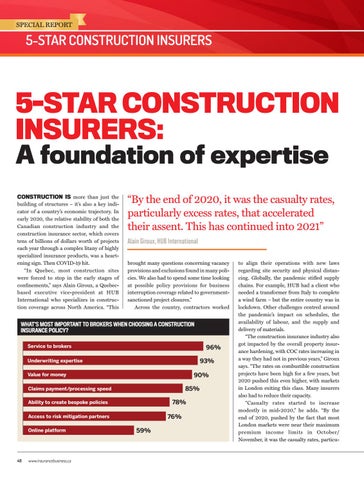 A foundation of expertise CONSTRUCTION IS more than just the building of structures – it’s also a key indicator of a country’s economic trajectory. In early 2020, the relative stability of both the Canadian construction industry and the construction insurance sector, which covers tens of billions of dollars worth of projects each year through a complex litany of highly specialized insurance products, was a heartening sign. Then COVID-19 hit. “In Quebec, most construction sites were forced to stop in the early stages of confinements,” says Alain Giroux, a Quebecbased executive vice-president at HUB International who specializes in construction coverage across North America. “This