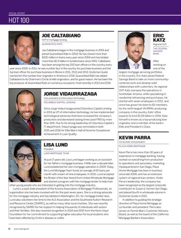 After working on one of the largest mortgage servicing portfolios in the country, Eric Katz joined Federal Savings Bank to take on more communitycentered work and develop solid relationships with customers. As regional SVP, Katz oversees the operations in Scottsdale, Arizona, while specializing in residential refinancing and purchases. He started with seven employees in 2012, and since has grown his team to 83 members. As the ninth-largest VA IRRRL-producing company in the country, Katz’ office expects to fund $1.65 billion in 2016. Katz himself is known as a top-producing loan originator and a member of his bank’s Elite and President’s Clubs.